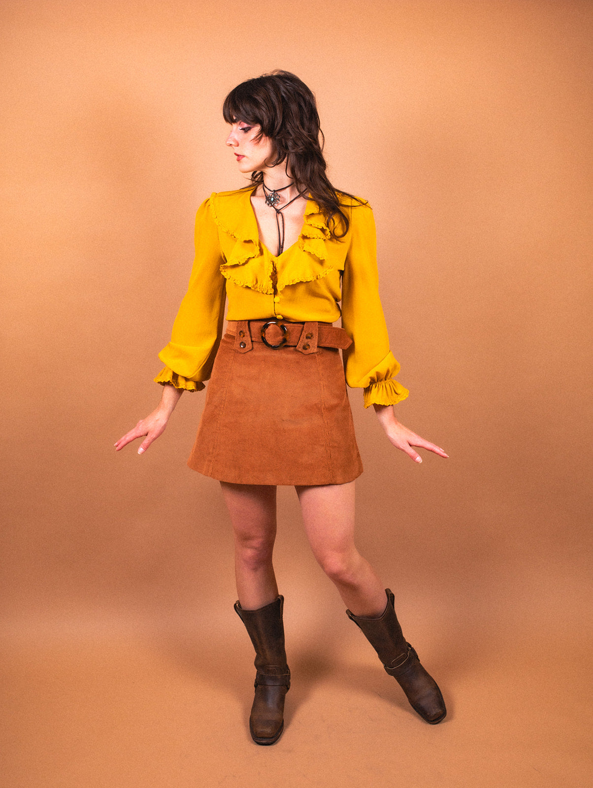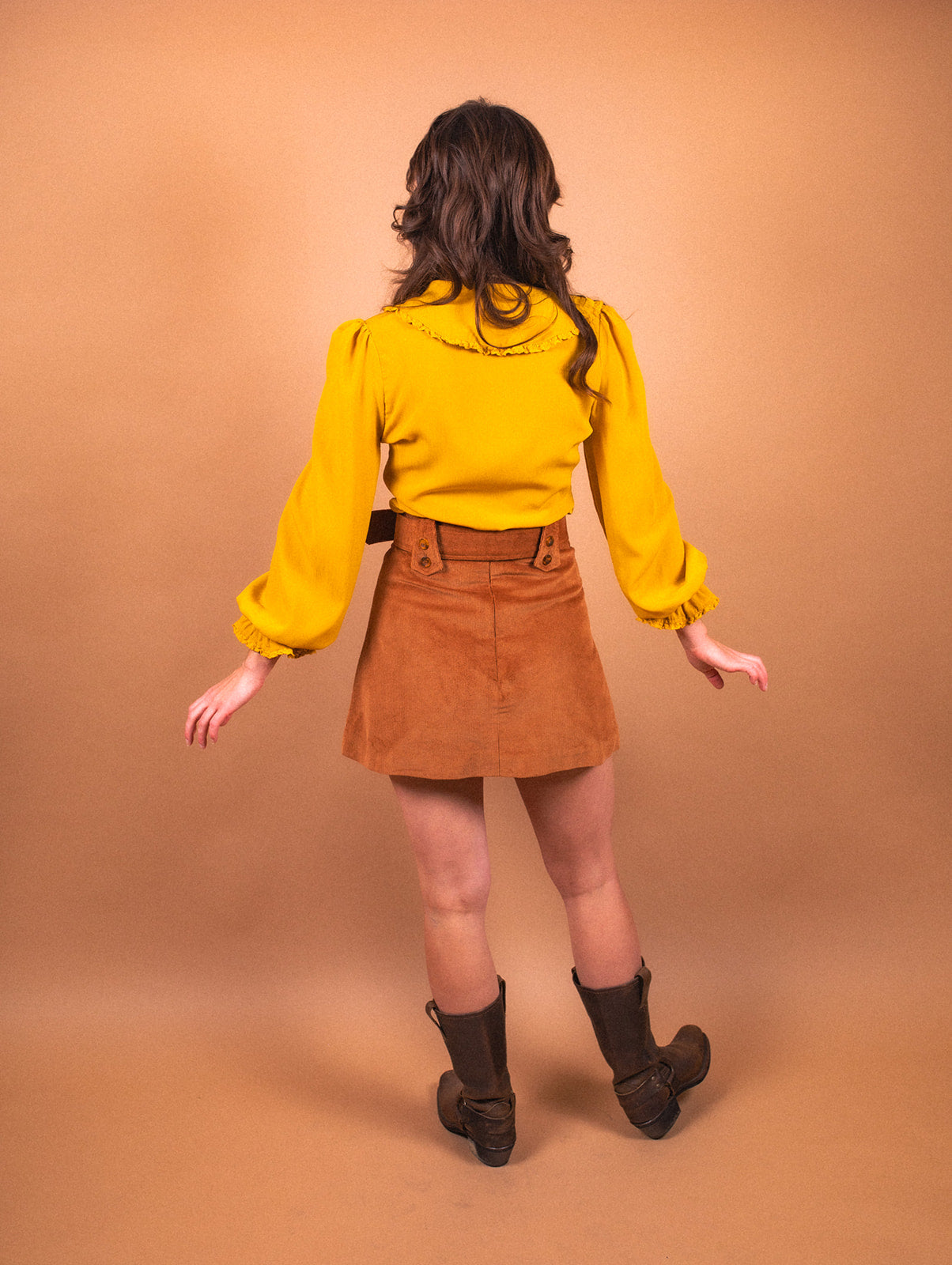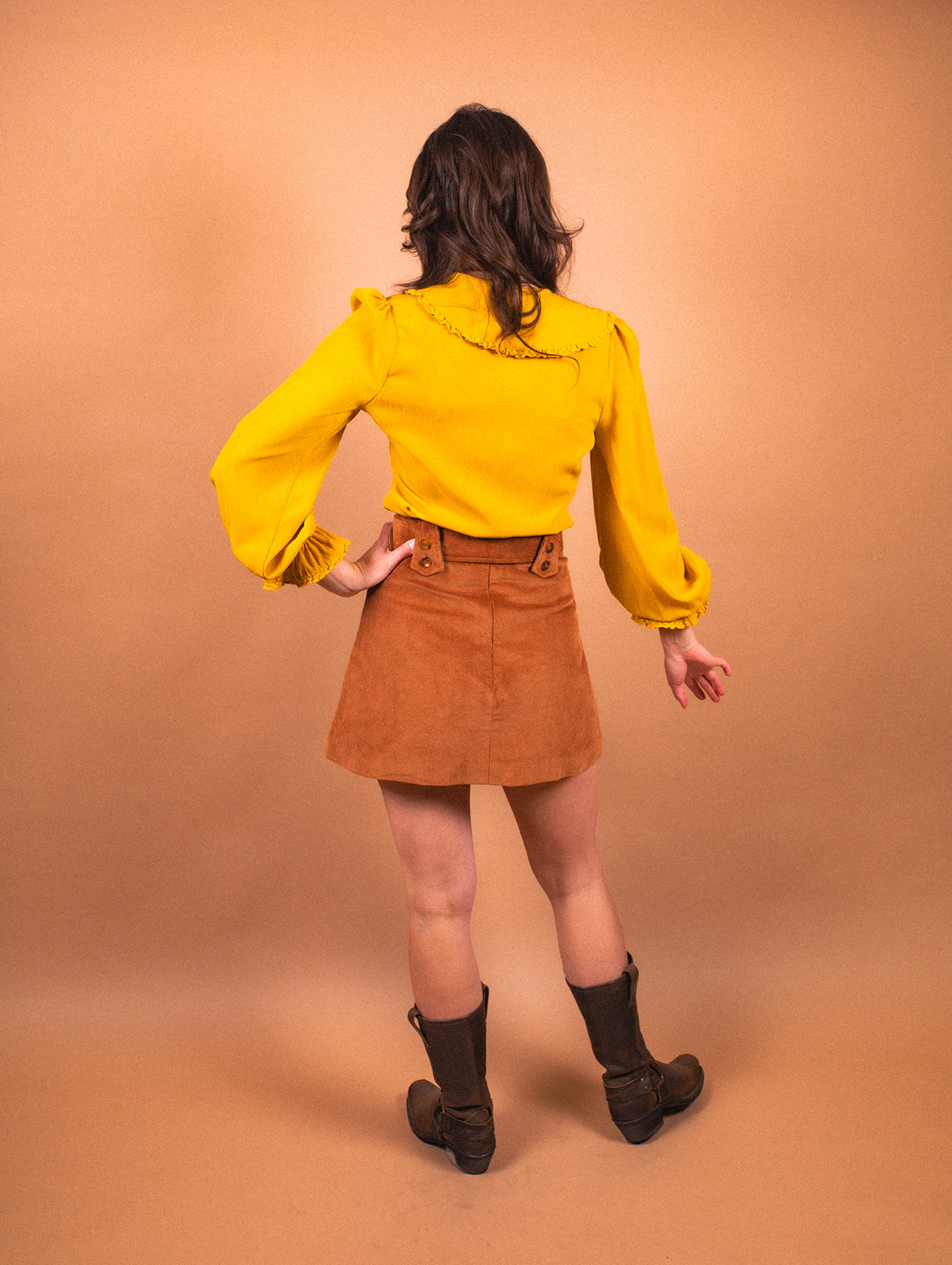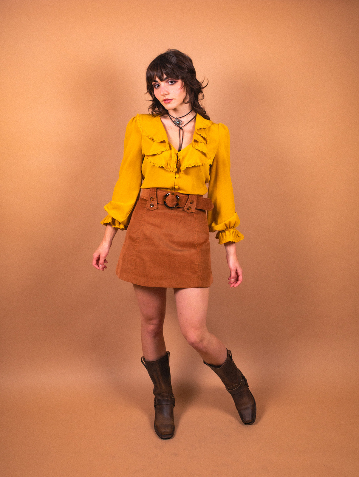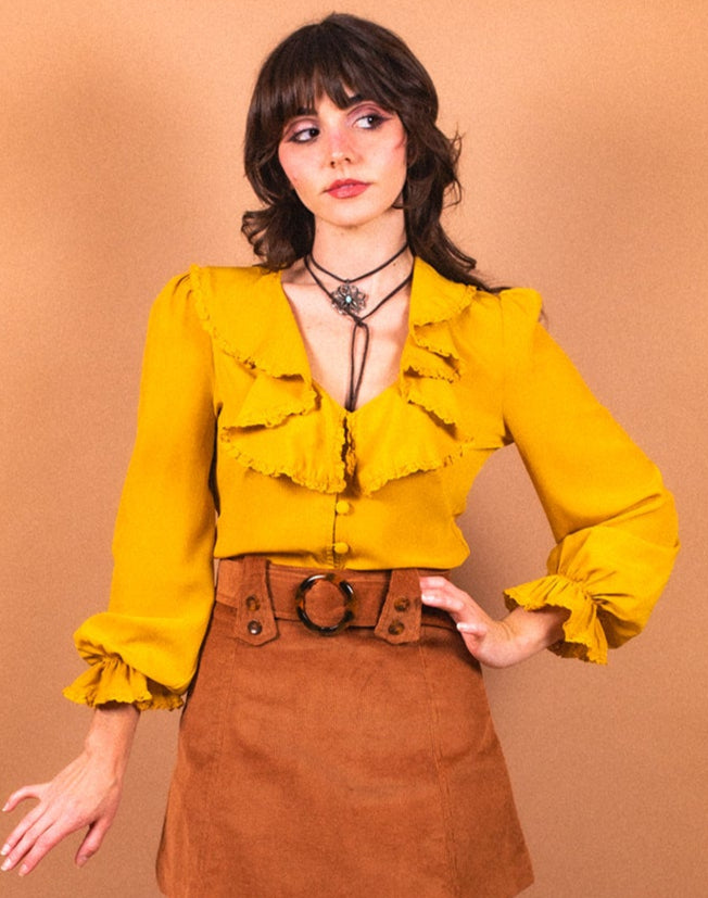 The Angelina ruffle collar blouse is the perfect mix of vintage charm and modern style. This blouse is the vintage-inspired staple your wardrobe needs. Perfect to style with your favourite mini skirt or jeans. Designed with a wide ruffle collar, long sleeves with an elasticated cuff, and a matching button front, the Angelina blouse is both flattering and stylish.